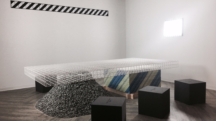 - Ковер “WET GRASS” — бело-зелёная поверхность с текстом, который вызывает когнитивный диссонанс и подчёркивает искусственность среды.
